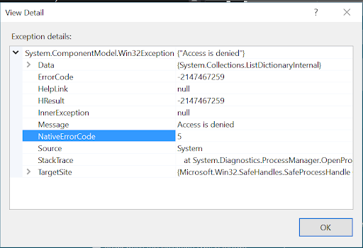 Click Download wait a bit until the update package is downloaded in the background while the crashreport window is still open. 1612147641 ERROR UiPathStudioexe 1 RemoteException wrapping SystemComponentModelWin32Exception. Access is denied at SystemDiagnosticsProcessManagerOpenProcessInt32 processId Int32 access Boolean. SystemComponentModelWin32Exception -- Access is denied Source SystemWindowsForms Stack Trace. Access is denied Description. Service Windows Defender Firewall MpsSvc cannot be configured due to the following error. My name is Archana CM from Microsoft SQL Developer Support team we support SQL Connectivity issue along with data access technologies and SSIS. Cannot execute a program. SystemComponentModelWin32Exception System Version2000 Cultureneutral PublicKeyTokenb77a5c561934e089 Message.